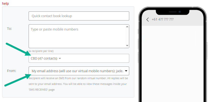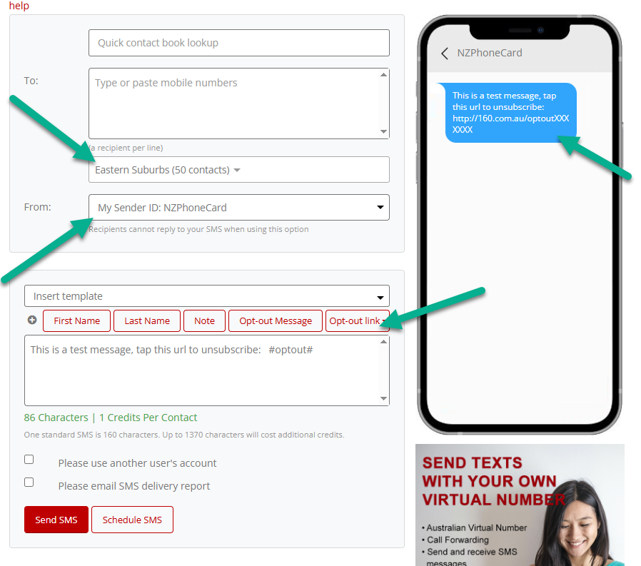 - Notice the mobile number +61 4?? ??? ??? on the mockup phone to the right? This means this option will use our virtual mobile number instead of the mobile number on your account. Recipients will also not be able to reply back to your SMS other than with the opt-out code.
