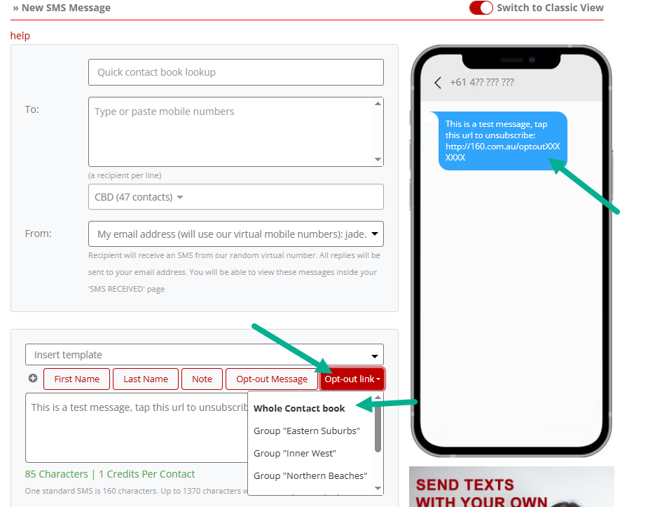 Now that you’ve told our system which contact group/s to apply the auto opt-out feature to, you can now select that option when composing your text message.